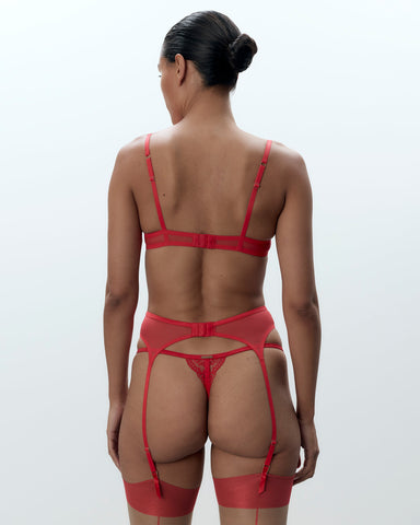 As part of one of our icon sets that has stood the test of time, the Marseille Embroidered Sheer Bra in red is crafted from our signature premium mesh with a delicately embroidered pattern of swirling florals to the cups and underband. A central V-wire adds structure to the centre gore, with adjustable shoulder straps for the perfect fit. Wear with matching briefs, thong and suspenders from the Marseille collection for the complete look.